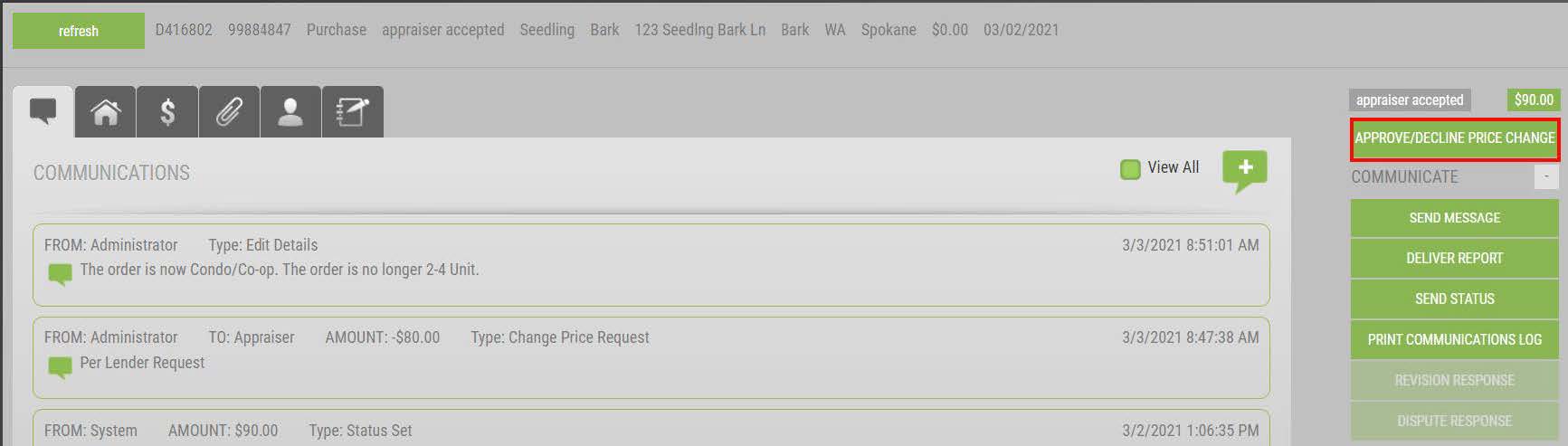 If a lender requests a price decrease, you will be sent an email notification of the request. When you access the order, click the option for Approve/Decline Price Change.