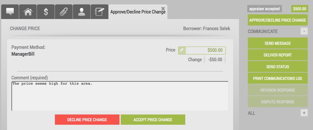 You can assess whether or not the new price is warranted and respond to the request appropriately by either selecting the Decline Price Change or Accept Price Change options. If you accept the price decrease, the amount will automatically be adjusted. If you decline the price change, your lender will be notified, and you can use the messaging feature to communicate with your lender to come to an alternate solution.