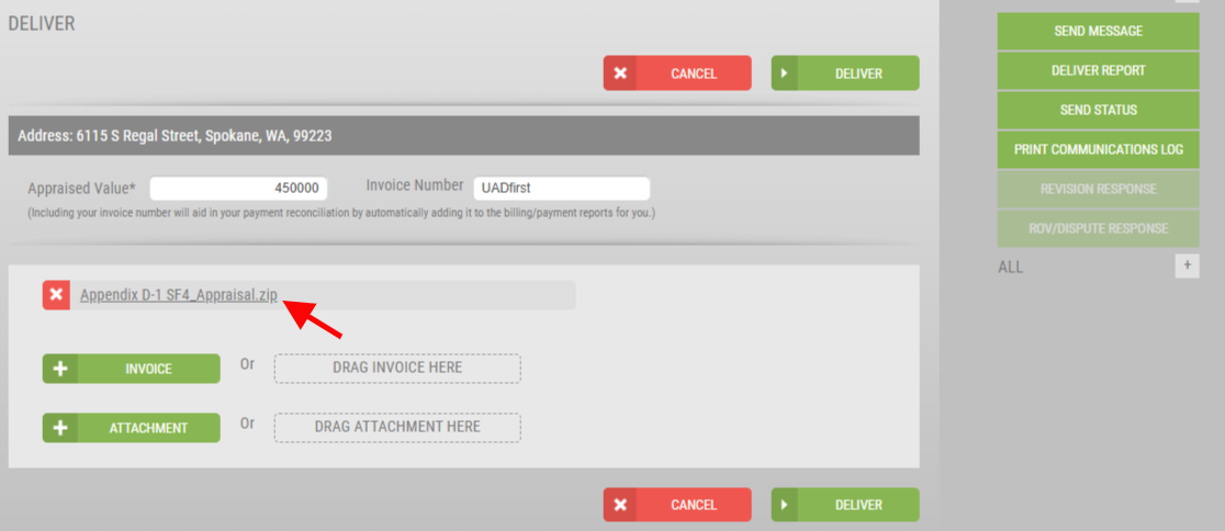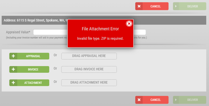 The delivery screen will look like the current version, however, when appraisers attempt to deliver the XML version of the report, they will encounter the File Attachment Error.
