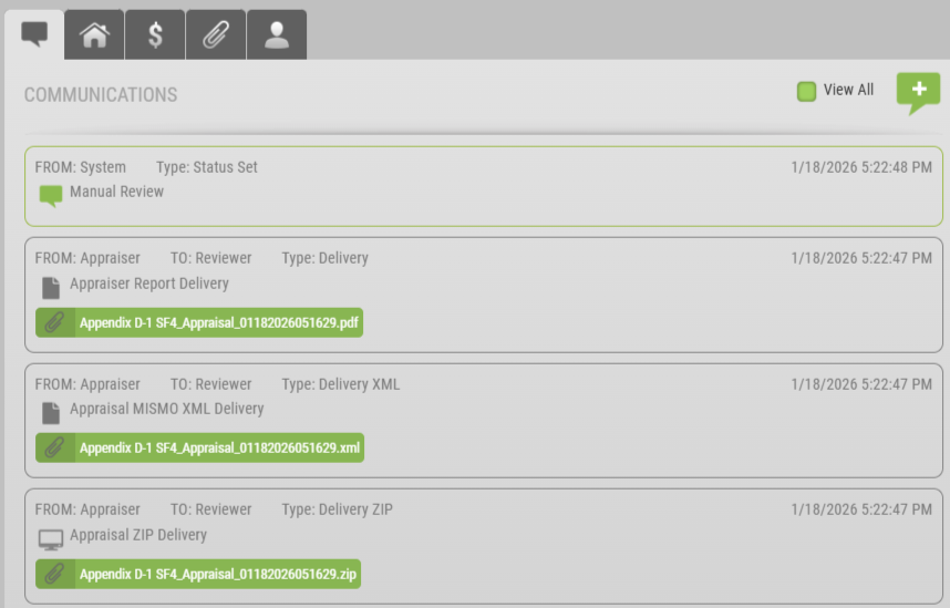Appraisers must include the XML and PDF version of the report within their ZIP file. Appraisal Firewall X's technology will automatically extract the XML and PDF versions of the appraisal report. The report is successfully delivered when appraisers are directed to the Communications Log. NOTE: UAD 3.6 will reflect three different line items: ZIP file, XML, and PDF.